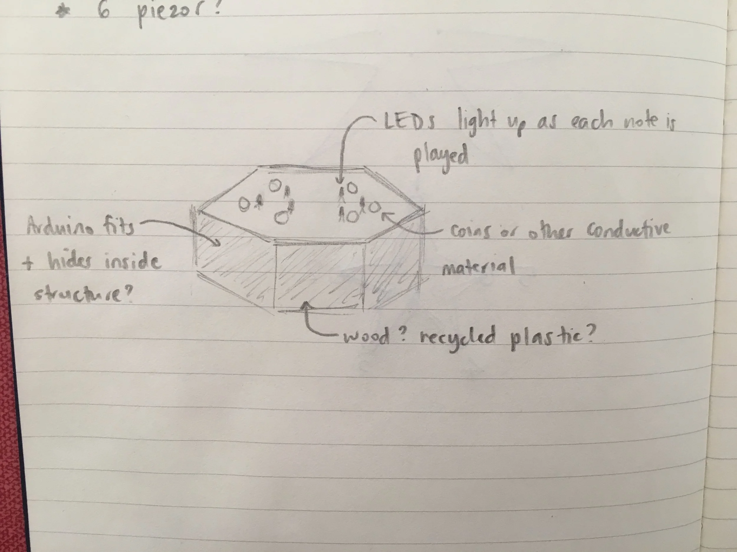 I am going to make a conductive keyboard with 6 notes (possibly 8), building on the conductive circuit I built in Arduino Project 13. I would like each note to also have an LED that lights up when the 'note' is played, as a visual representation of the current. I want it to be fun, sound lovely, and have a contemporary design focus.